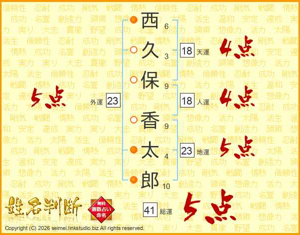 西(6画)久(3画)保(9画) 香(9画)太(4画)郎(10画)