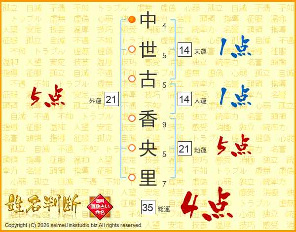 中(4画)世(5画)古(5画) 香(9画)央(5画)里(7画)