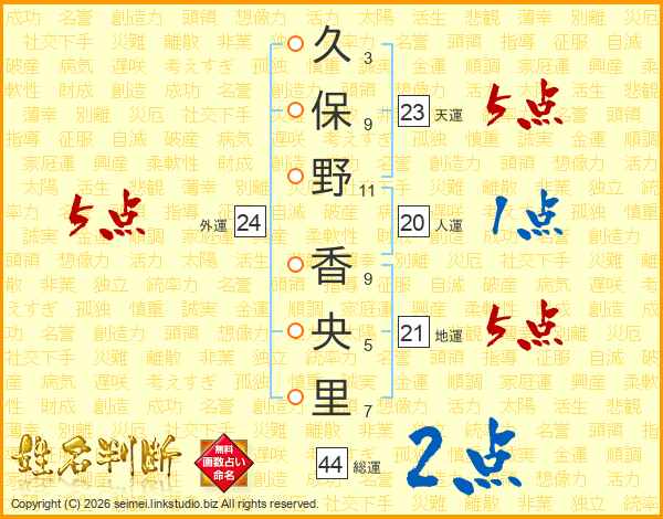 久(3画)保(9画)野(11画) 香(9画)央(5画)里(7画)