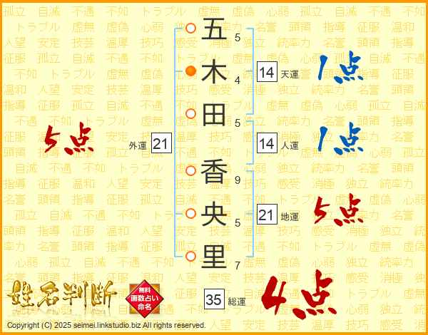 五(5画)木(4画)田(5画) 香(9画)央(5画)里(7画)
