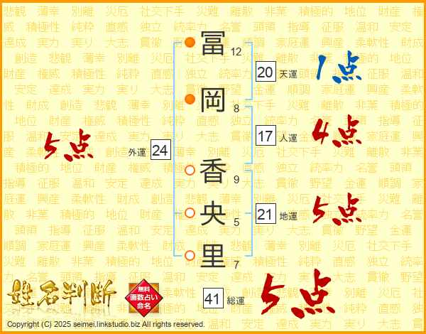 冨(12画)岡(8画) 香(9画)央(5画)里(7画)