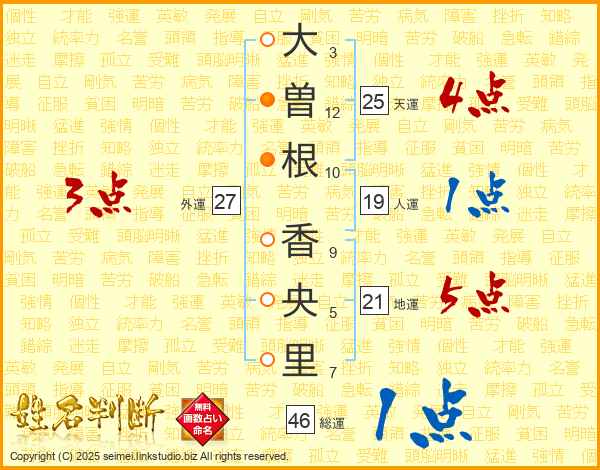 大(3画)曽(12画)根(10画) 香(9画)央(5画)里(7画)