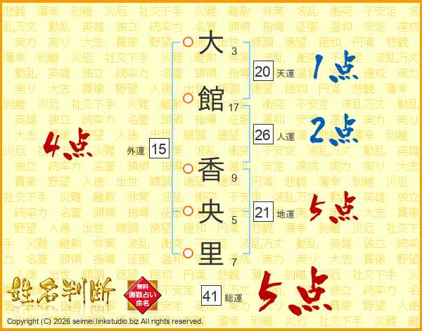 大(3画)館(17画) 香(9画)央(5画)里(7画)