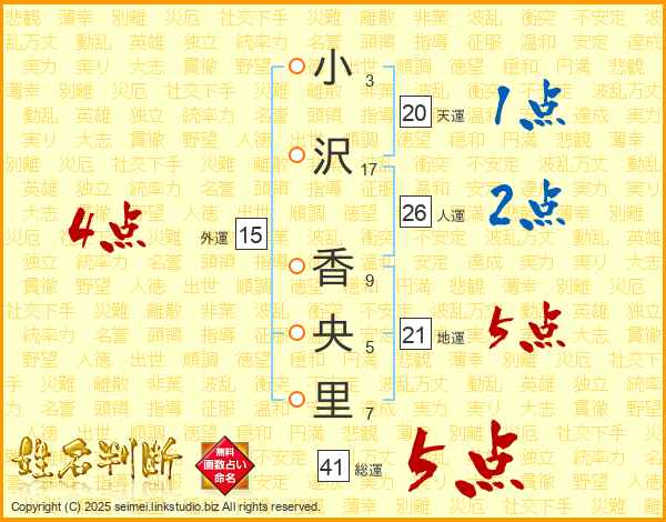 小(3画)沢(17画) 香(9画)央(5画)里(7画)