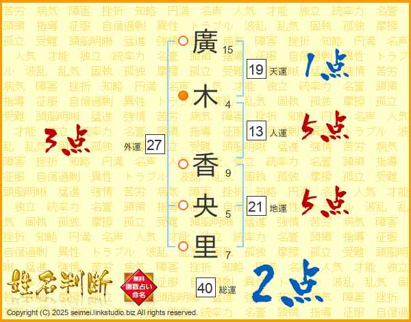 廣(15画)木(4画) 香(9画)央(5画)里(7画)