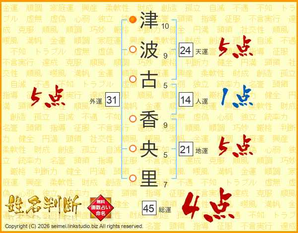 津(10画)波(9画)古(5画) 香(9画)央(5画)里(7画)