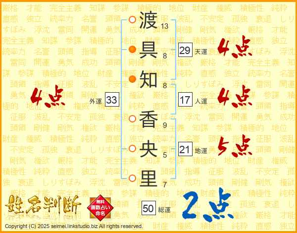 渡(13画)具(8画)知(8画) 香(9画)央(5画)里(7画)