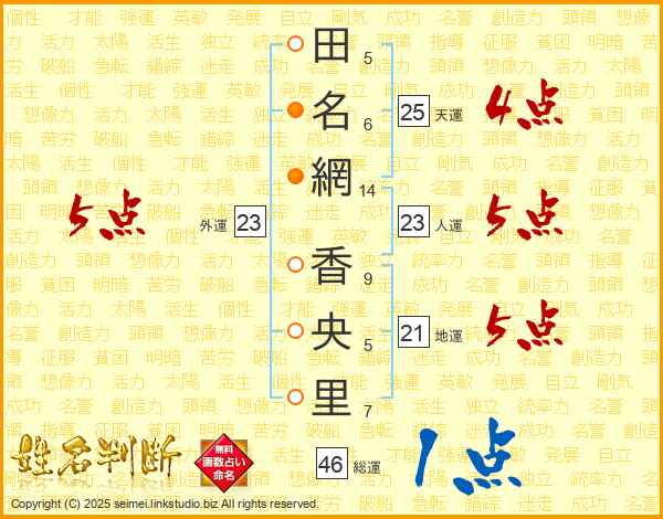 田(5画)名(6画)網(14画) 香(9画)央(5画)里(7画)