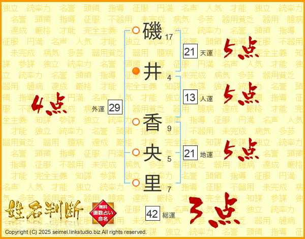 磯(17画)井(4画) 香(9画)央(5画)里(7画)