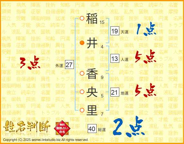 稲(15画)井(4画) 香(9画)央(5画)里(7画)