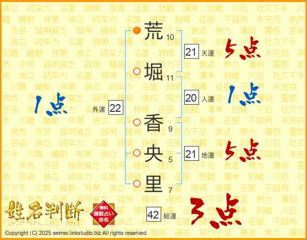 荒(10画)堀(11画) 香(9画)央(5画)里(7画)