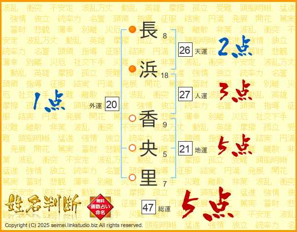 長(8画)浜(18画) 香(9画)央(5画)里(7画)