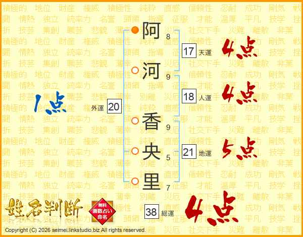 阿(8画)河(9画) 香(9画)央(5画)里(7画)