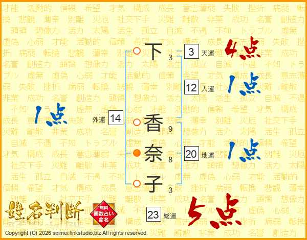 生活面を象徴する運勢です。外部から受ける影響力を表し、結婚運、家庭運や職場、環境への順応性を表します。総運から人運を引いた画数。姓や名が1文字の場合を除く。