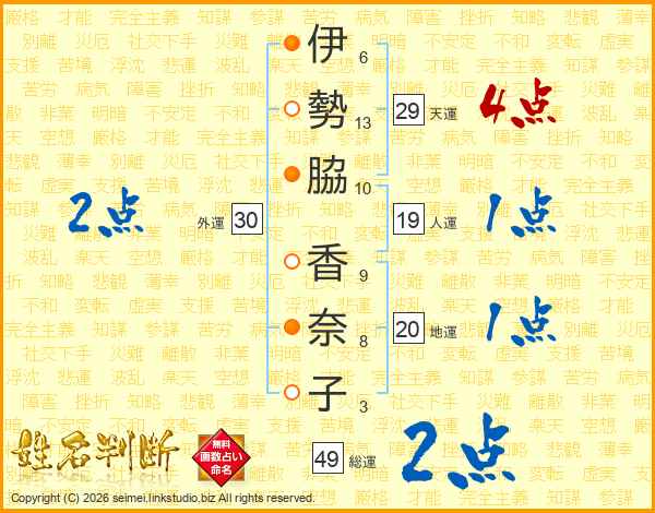 伊(6画)勢(13画)脇(10画) 香(9画)奈(8画)子(3画)