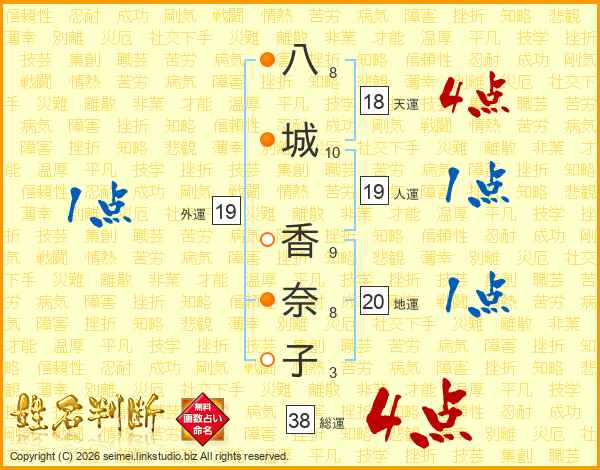 八(8画)城(10画) 香(9画)奈(8画)子(3画)