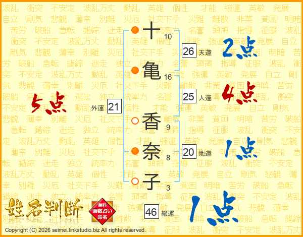 十(10画)亀(16画) 香(9画)奈(8画)子(3画)
