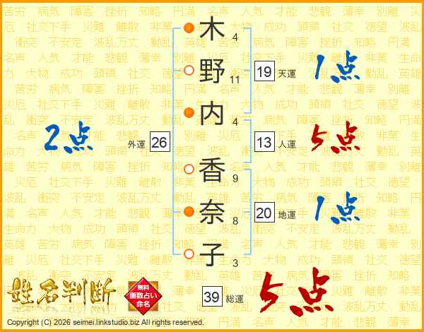 木(4画)野(11画)内(4画) 香(9画)奈(8画)子(3画)