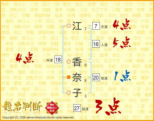 生活面を象徴する運勢です。外部から受ける影響力を表し、結婚運、家庭運や職場、環境への順応性を表します。総運から人運を引いた画数。姓や名が1文字の場合を除く。