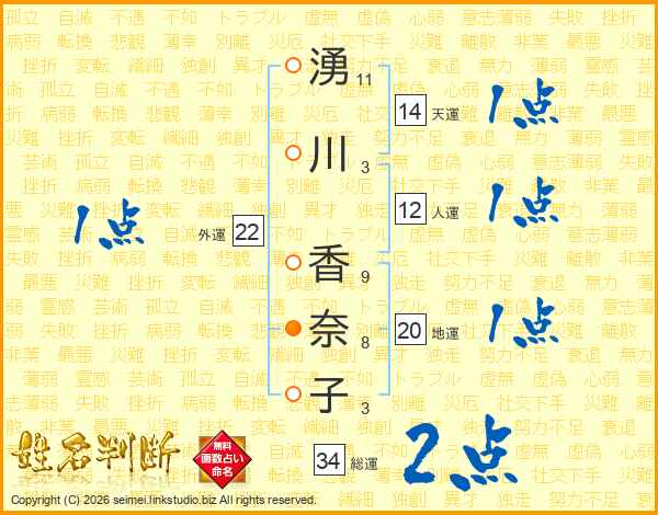 湧(11画)川(3画) 香(9画)奈(8画)子(3画)