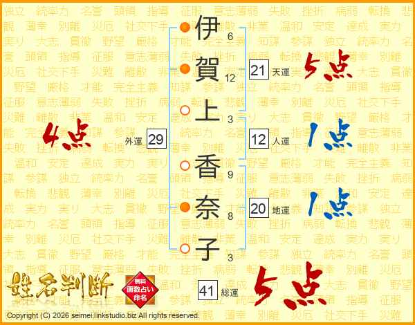 伊(6画)賀(12画)上(3画) 香(9画)奈(8画)子(3画)
