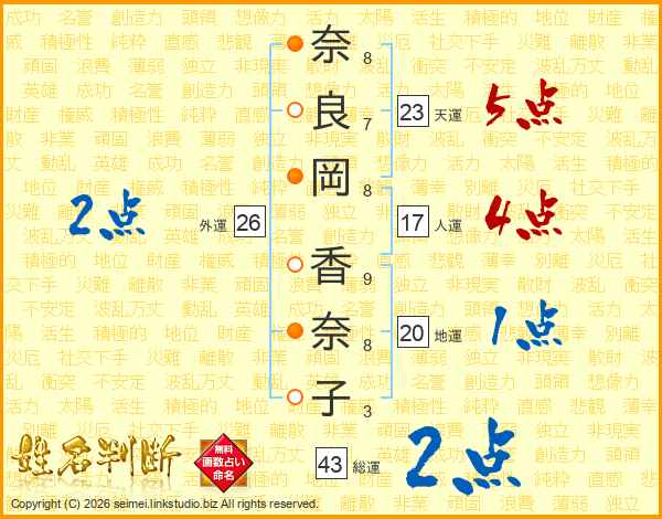 奈(8画)良(7画)岡(8画) 香(9画)奈(8画)子(3画)