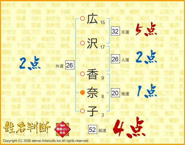 広(15画)沢(17画) 香(9画)奈(8画)子(3画)