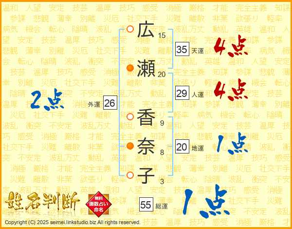 広(15画)瀬(20画) 香(9画)奈(8画)子(3画)