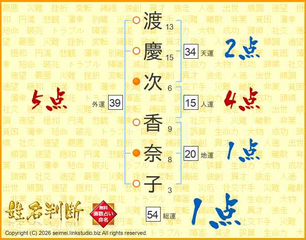 渡(13画)慶(15画)次(6画) 香(9画)奈(8画)子(3画)