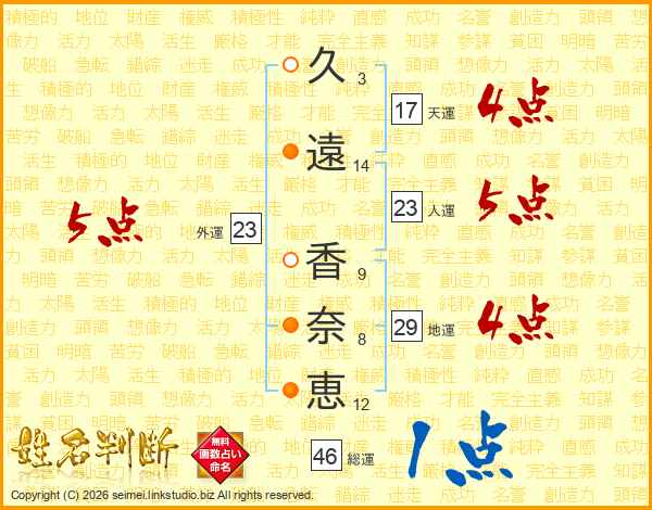 久(3画)遠(14画) 香(9画)奈(8画)恵(12画)