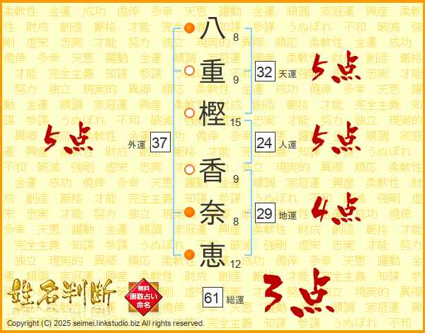 八(8画)重(9画)樫(15画) 香(9画)奈(8画)恵(12画)