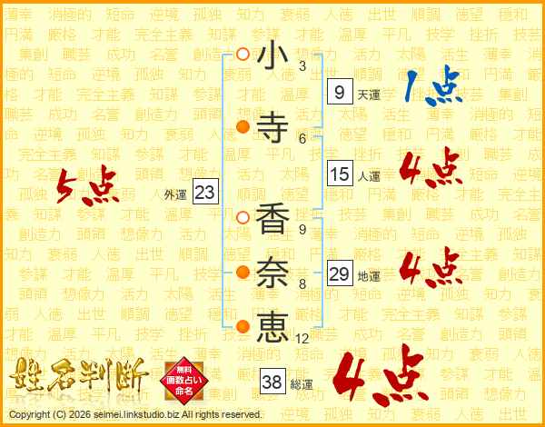 小(3画)寺(6画) 香(9画)奈(8画)恵(12画)