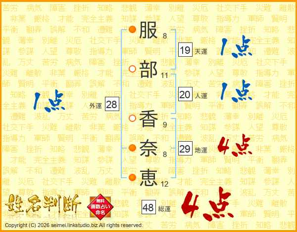 服(8画)部(11画) 香(9画)奈(8画)恵(12画)