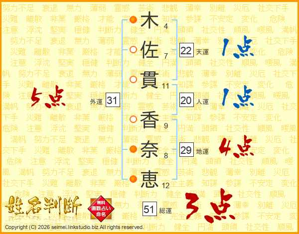 木(4画)佐(7画)貫(11画) 香(9画)奈(8画)恵(12画)