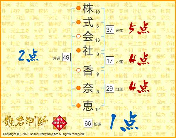 株(10画)式(6画)会(13画)社(8画) 香(9画)奈(8画)恵(12画)