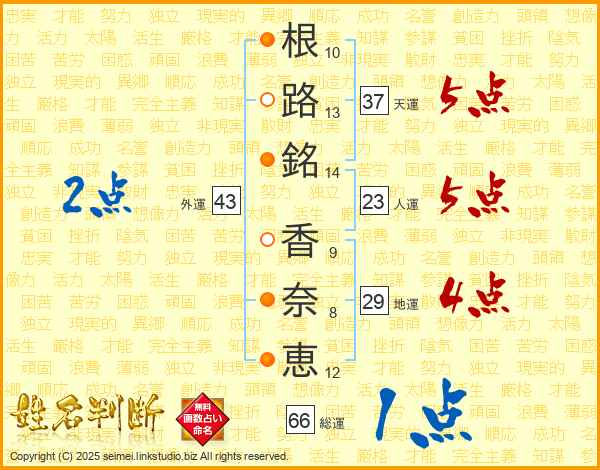根(10画)路(13画)銘(14画) 香(9画)奈(8画)恵(12画)