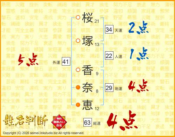 桜(21画)塚(13画) 香(9画)奈(8画)恵(12画)