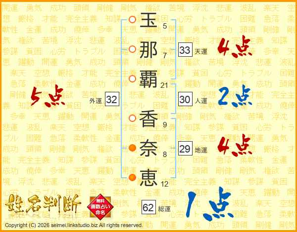 玉(5画)那(7画)覇(21画) 香(9画)奈(8画)恵(12画)