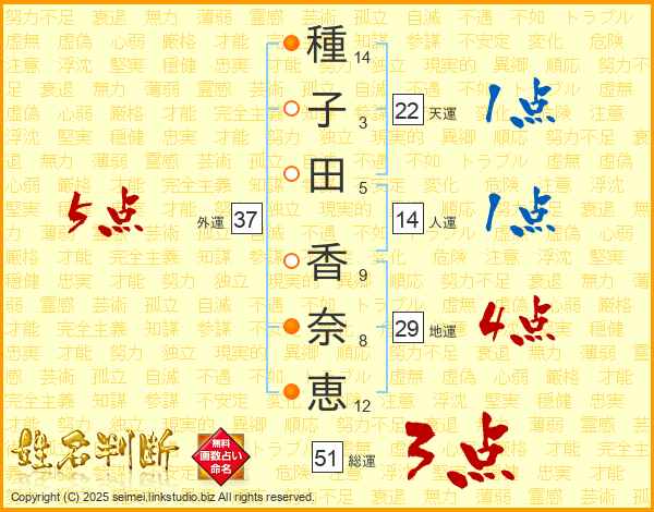 種(14画)子(3画)田(5画) 香(9画)奈(8画)恵(12画)
