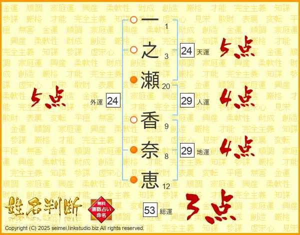 一(1画)之(3画)瀬(20画) 香(9画)奈(8画)恵(12画)