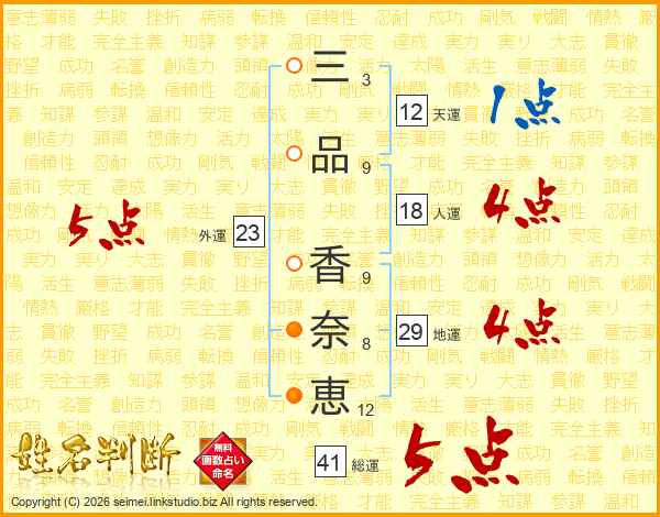 三(3画)品(9画) 香(9画)奈(8画)恵(12画)