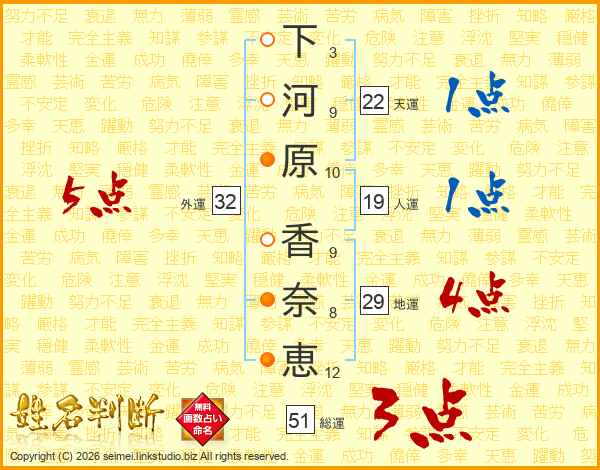 下(3画)河(9画)原(10画) 香(9画)奈(8画)恵(12画)