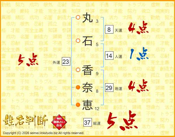 丸(3画)石(5画) 香(9画)奈(8画)恵(12画)