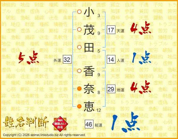 小(3画)茂(9画)田(5画) 香(9画)奈(8画)恵(12画)