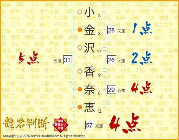 小(3画)金(8画)沢(17画) 香(9画)奈(8画)恵(12画)