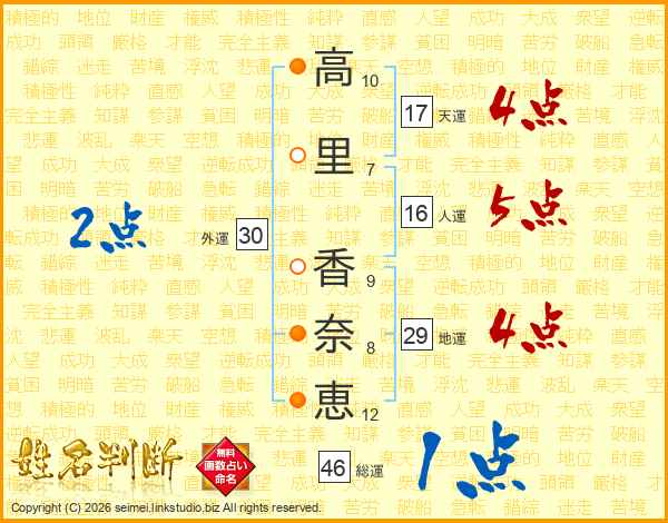 高(10画)里(7画) 香(9画)奈(8画)恵(12画)