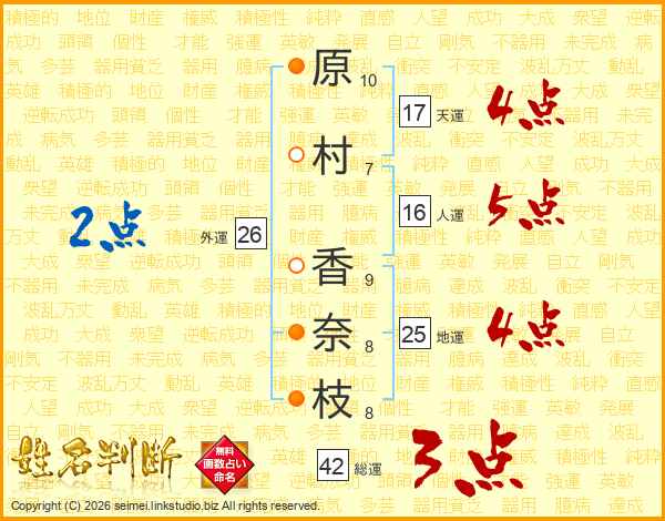 原(10画)村(7画) 香(9画)奈(8画)枝(8画)
