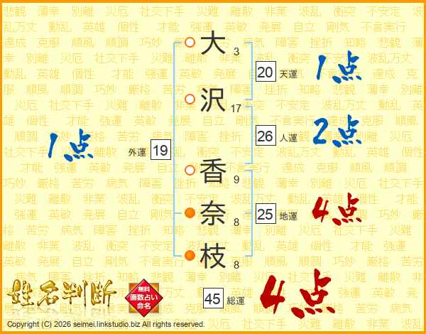 大(3画)沢(17画) 香(9画)奈(8画)枝(8画)