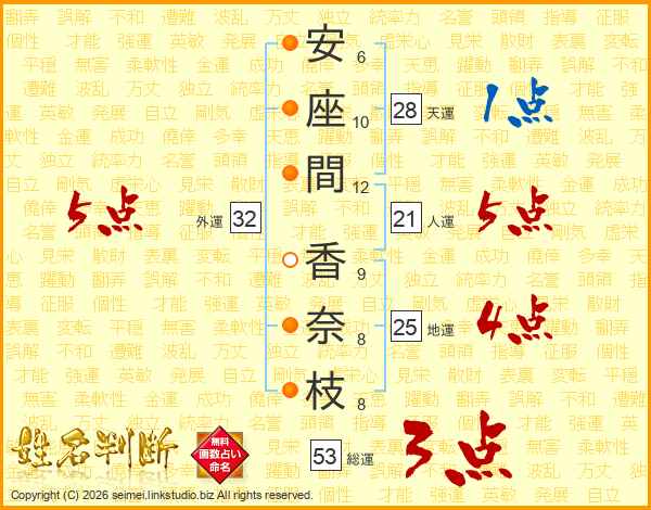 安(6画)座(10画)間(12画) 香(9画)奈(8画)枝(8画)