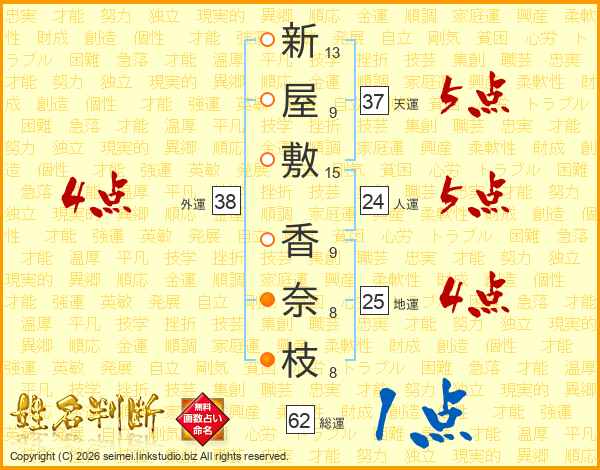 新(13画)屋(9画)敷(15画) 香(9画)奈(8画)枝(8画)